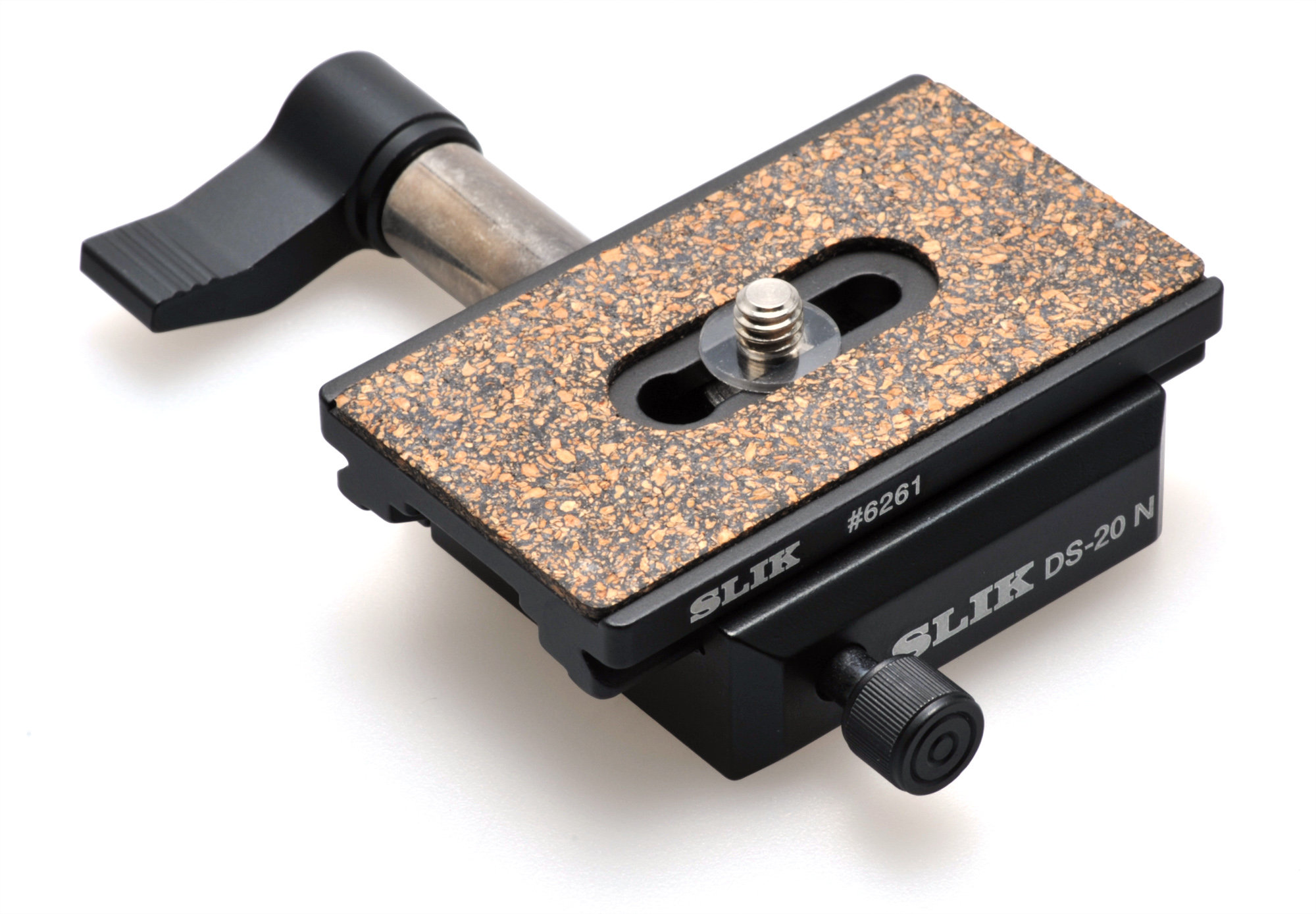 DS-20N独自のデザインとして、一般的には「ノブ式」となるシューの固定を、「ラチェット式レバー」とすることで、操作性を向上。ON-OFF可能な脱落防止ロック付き。クイックシューとカメラの取り付けはコイン溝入のネジ式。カメラネジ締め付け工具を付属しています。