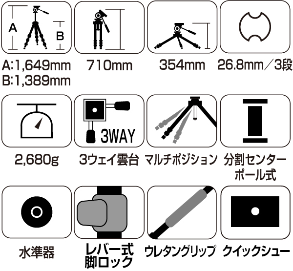 AMT(アルミ・マグネシウム・チタン合金)採用パイプで、軽量化とお手頃価格を両立。動画対応3ウェイ雲台「SH-736 HD N」を装備した中型三脚です。中級デジタル一眼レフの写真撮影と動画撮影の両方に対応します。 [2012年11月16日発売]