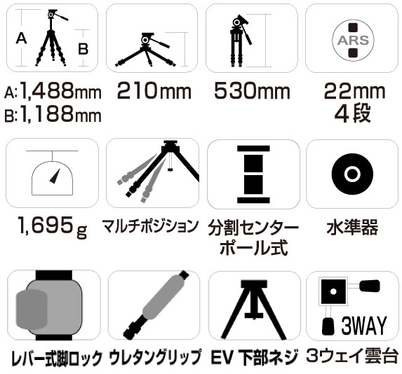 開脚角度を変更できるマルチポジションと、下半分が取り外せる分割式のエレベーターにより、ローポジション撮影も素早くセット可能です。三脚ケース付き。3本のパイプには持ち運ぶ際に手が冷たくなりにくい、ウレタングリップを装備。